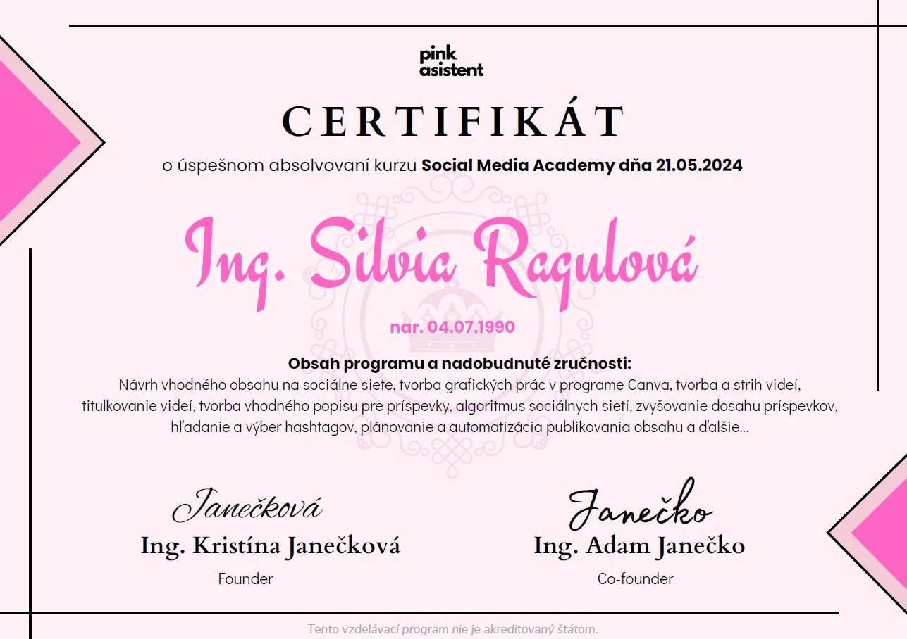 A prečo práve ja? Pretože som zodpovedná, komunikatívna a otvorená osoba. Neustále sa rada vzdelávam a napredujem v kariére. Navyše mám analytické myslenie a dobrú pamäť. So mnou sa už nemusíš báť, že zabudneš na dôležité termíny alebo stretnutia.